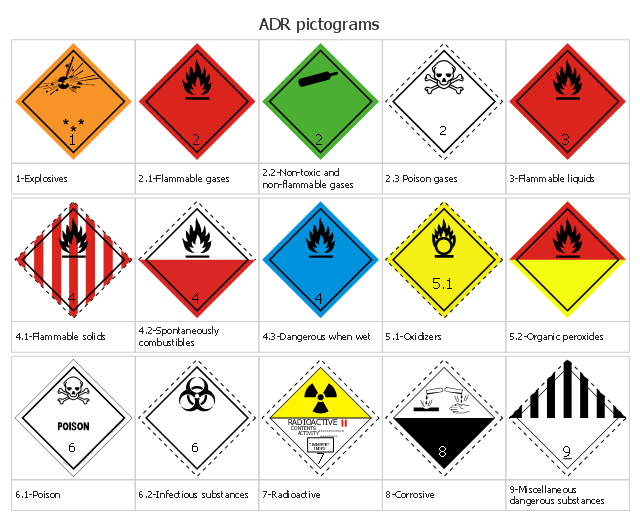L'A.D.R. suddivide le materie e gli oggetti pericolosi in 13 classi in base al tipo di pericolo principale che rappresentano, identificati da un'etichetta da applicare sui colli, sui container, e nel caso anche sul mezzo.